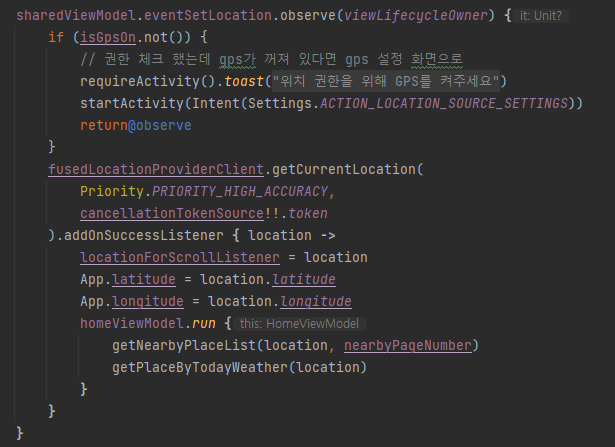 isGpsOn 변수를 이용하여 위치를 가져오기 전 isGpsOn 값을 확인한다.