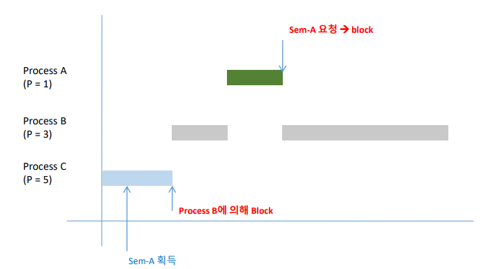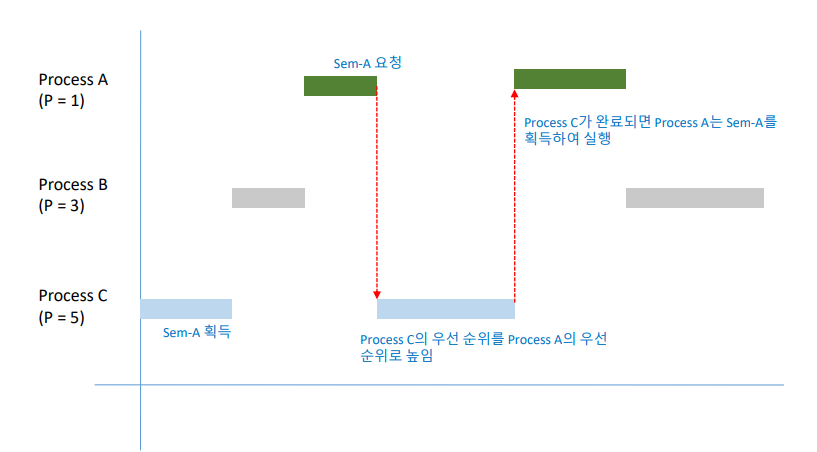 ‒ 우선 순위가 높은 Process가 같은 자원을 요청하면 기존 Process의 우선 순위 는 자원을 요청한 Process의 우선 순위로 높아짐