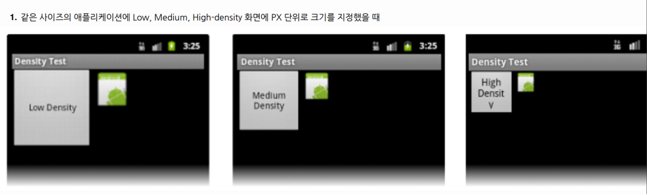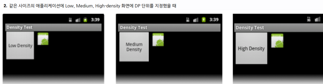 그래서 안드로이드에서는 이 문제를 방지하기 위해 밀도 독립형 픽셀(dp)을 만들어 밀도(해상도)가 서로 다른 화면에서 UI 표시 크기를 유지 할수 있도록 했다.