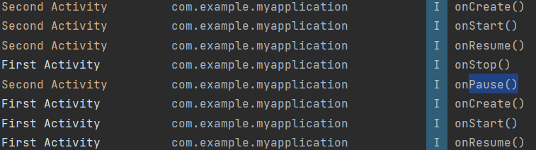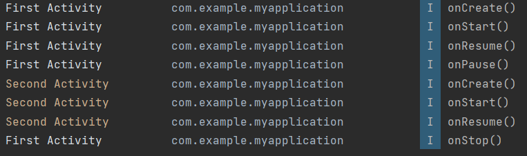 Main Activity의 버튼을 누르면 MainActivity가 먼저 pause되고 SecondActivity가 실행되기 시작한다. Second Activity가 완전이 실행되고 나서야 Main Activity가 stop이된다.