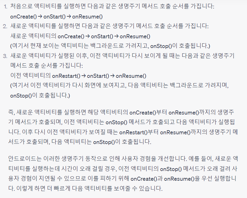 이렇다고 한다. 즉, onPause -> onStop -> onCreate로 동작을 하게되면 이전 액티비티에서 onStop()이 오래걸릴 경우 onCreate()도 오래 걸리니 새로운 액티비티가 보이는데 까지 시간이 지연되어 사용자 경험을 떨어뜨린다고한다.
