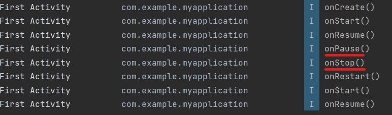 밑줄 친 부분이 홈 화면으로 나갔을 때의 호출된 생명 주기이다. onPause -> onStop이 불려 액티비티가 Stop상태가 된다.